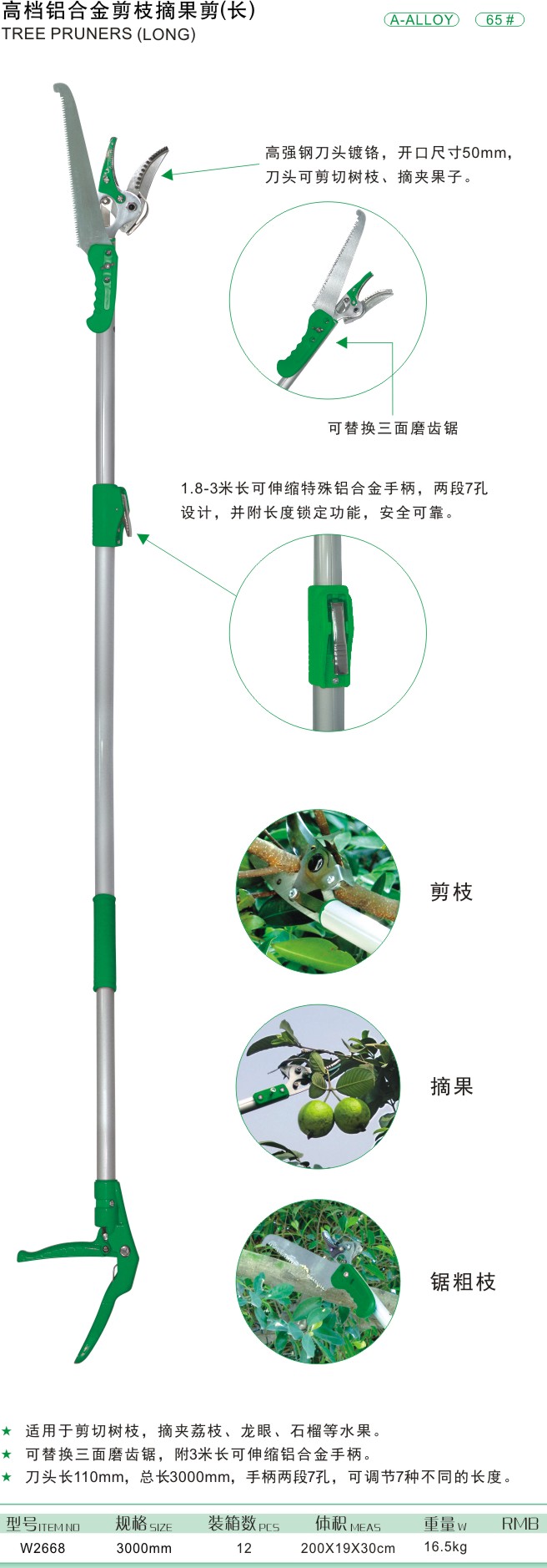 可替換三面磨齒鋸,附3米長可伸縮鋁合金手柄。
