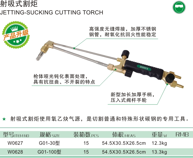 射吸式割炬使用氧乙炔氣源,是切割普通和特殊形狀碳鋼的專用工具。