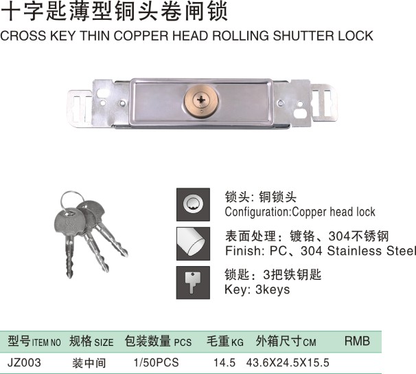 JZ003<br>十字匙薄型銅頭卷閘鎖