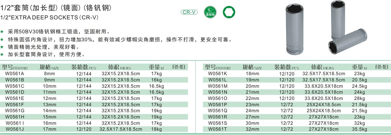 1/2"套筒(加長型)(鏡面)(鉻釩鋼)