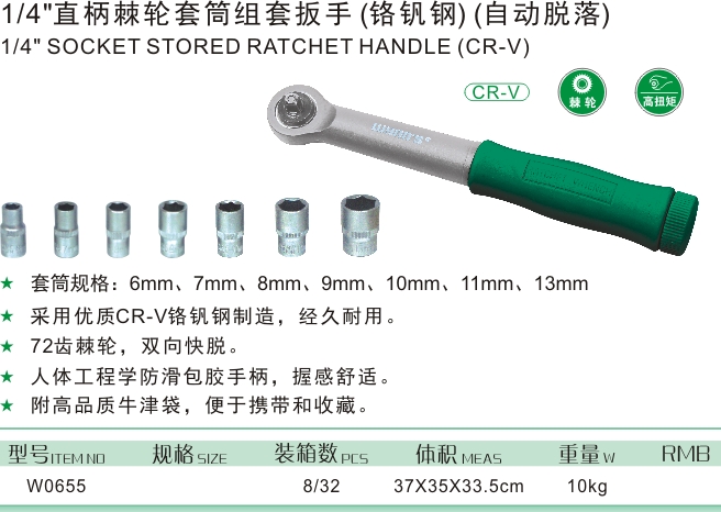 1/4"直柄棘輪套筒組套扳手 (鉻釩鋼) (自動脫落)